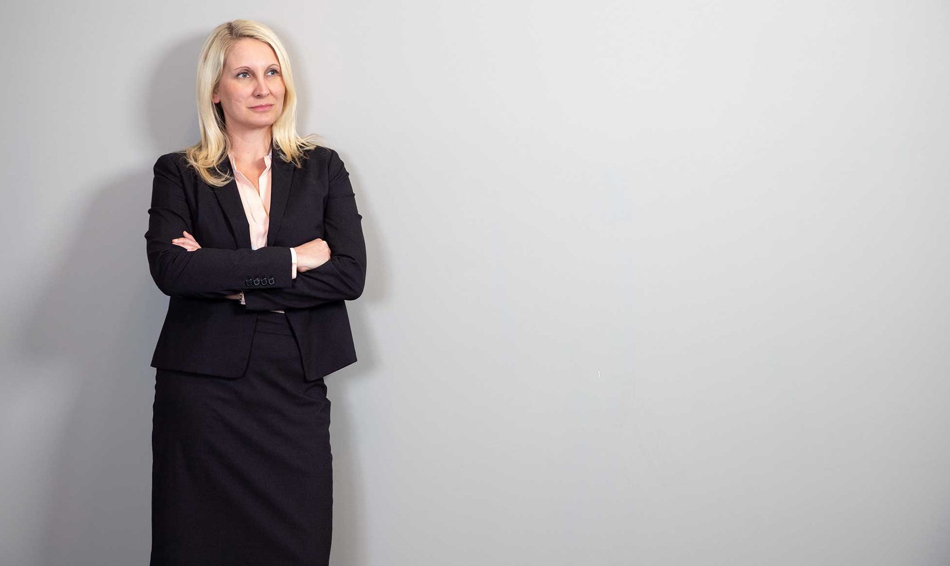 This image is Janet Amburgeys website biography image It depicts Janet standing against a gray wall in their newly designed and renovated offices in historic downtown Asheville